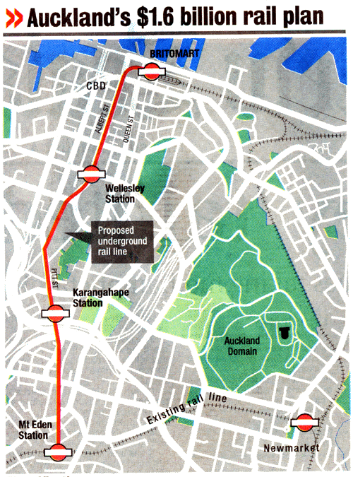 But this morning ( 2003 December 9 ) the map which appears on the left was published in the Herald. It shows an underground railway up Albert Street - and a "future North Shore link" going off in a ridiculous direction ! The intention is to cross the harbour somewhere near the present harbour bridge, thereby missing out the whole Devonport peninsula. It is perhaps argued that people will drive to Takapuna, then transfer to the train; perhaps some will, but once they're in their cars they're just as likely to drive over the bridge. A railway up the peninsula would be much more likely to tempt regular travellers to Auckland. It is clearly a matter of some urgency to make my proposal available.
