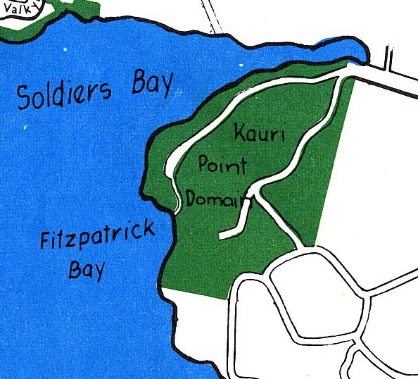 The story so far : Jean and Alan went for a walk in the Kauri Point Domain, and found a path they hadn't tried before. It was deemed not at all bad, so we included it in our records, and here it is again, on the right. Now read on ...