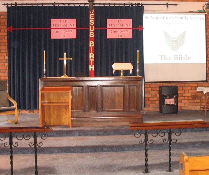 CARDS There is a card for each of the eight groups of books ( or sometimes a single book ) of the Bible mentioned in the service. Each card is presented as a poster to be fixed to the wall, and shows the name of the group of books and a list of the individual books in the group. There are four cards for each of the Testaments; we put the Old Testament cards on one side of the church, and the New Testament cards on the other.