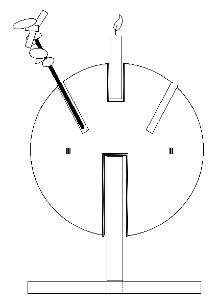 Line drawing of the christingle, showing all the parts. Photograph of the demonstration christingle on its stand, with the arms in place and the candle lit, with a real chistingle to show the scale.