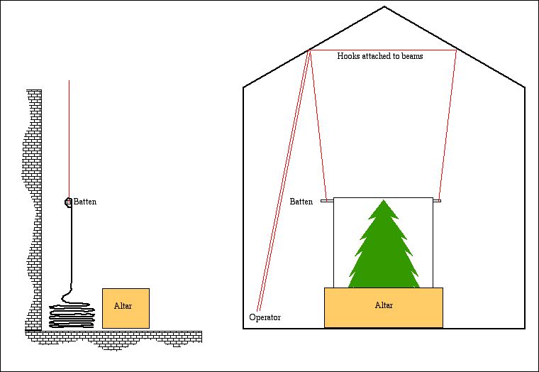 The tree operator is concealed from view ( originally behind furniture and an ornamental palm in the front left corner of the church, but more generally improvised ). He doesn't do anything particularly alarming, but we decided that to have him in full view would be an unhelpful distraction. As the service proceeds, he must raise the tree step by step. We found it adequate to do this without any clever bits, pulling the strings by hand and fixing them on a cleat between raises. We found it necessary to keep the strings separate; an early experiment with the strings wound in parallel onto a single drum failed because of unpredictable and unsymmetrical stretching in the strings.
