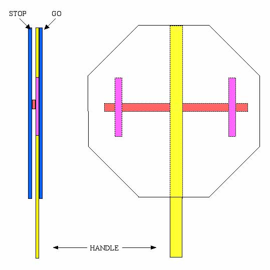 There is nothing particularly clever about it. Perhaps the main feature is its rather sturdy construction, intended mainly to ensure that the sign didn't fall apart when rotated fairly briskly to show alternately STOP and GO signals. The diagram below illustrates our design. It was about 70cm across and mounted on a 1.5m stick. The yellow, pink, and purple bits are wood. ( The colours have no significance; they are intended only to identify the parts in the two views. )